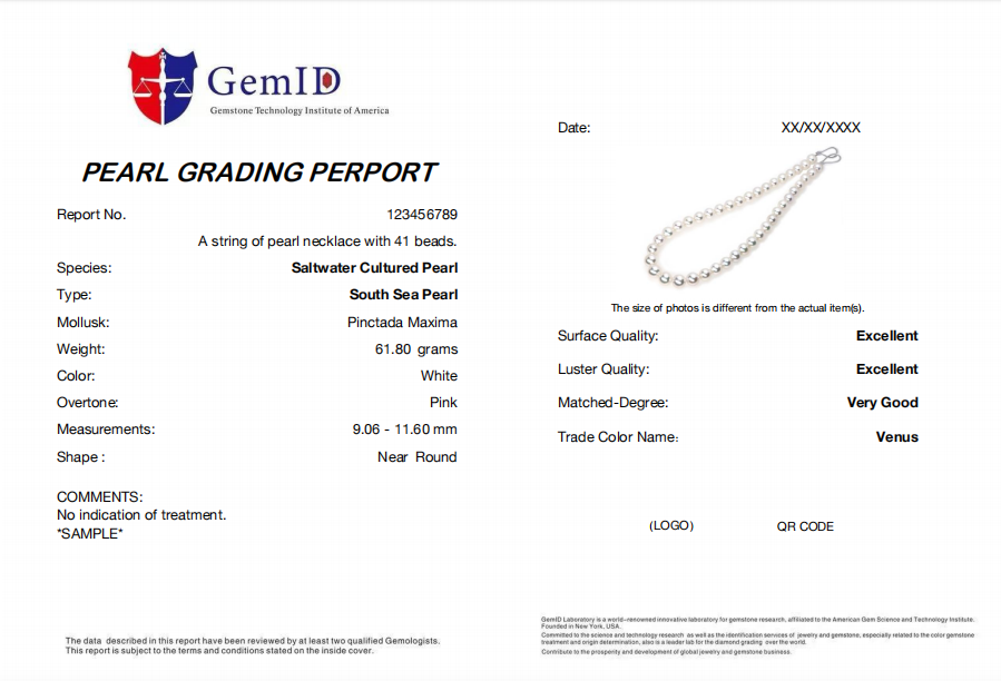 The GemID Gemstone Report is divided into Colored Stone Report and Pearl Report, Pearl Report is applicable to pearls and pearl products, and the identification and grading information in Pearl Report